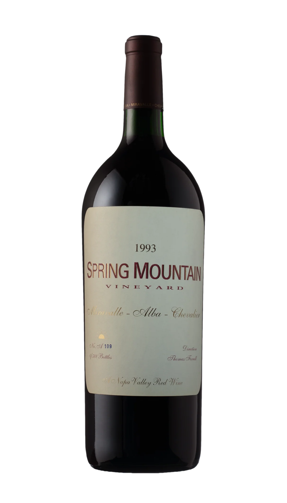 The inaugural release. Spring Mountain Vineyard was newly formed in 1992 and released its first wine from the 1993 vintage. The estate vineyards included Chevalier, Miravalle, and Alba, with additional fruit from the neighboring York Creek vineyard – making this the only non-estate bottled wine in the SMV portfolio.